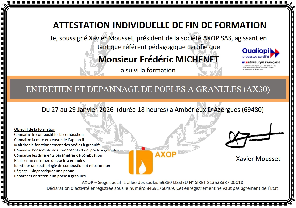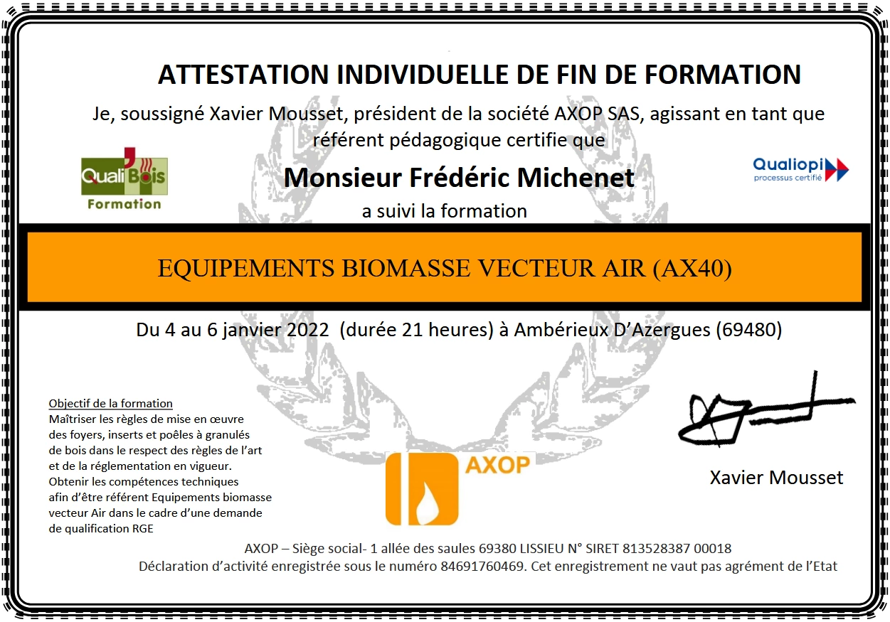 Basée sur 171 avis J'ai appelé ce monsieur pour lui demander un ramonage. Je lui ai expliqué avoir des problèmes de tirage. Il a pris le temps de me donner des conseils alors qu'il était en rendez-vous clientèle. J'ai donc écouté ses conseils et cela régler mon problème. Donc pas besoin de son intervention mais il sera mon prochain ramoneur c'est une certitude. Ce monsieur voulait en confiance on voit qu'il connaît fortement son métier et qu'il n'est pas là pour vous soutirer de l'argent. Je le recommande grandement. julien beyaert7 Novembre 2025 Professionnel efficace et de confiance Ulrich Akodjenou5 Novembre 2025 Très professionnaliste. Travail soigné et de bons conseils M. Germain DOMINIQUE LAURENT25 Août 2025 Je fais confiance à monsieur Michenet depuis plusieurs années pour l’entretien de mon poêle à granules ainsi que pour le ramonage du conduit d’évacuation des fumées. Il est toujours efficace et de bons conseils. Je le recommande amplement. Karim GUESMIA21 Août 2025 Professionnel très sérieux Jamal Haddaoui21 Août 2025 Sollicité pour un débistrage avant pose d'un insert. Délai rapide et devis respecté MAIS travail inefficace : grande quantité de scories qui continue à tomber du conduit après pose de l'insert. Véronique Charlotte19 Novembre 2024 Ponctualité, ramonage réalisé proprement et conseils pour l'utilisation du poêle. Je recommande l'entreprise Fumisterie Michenet. Hervé Chevallier6 Novembre 2024 C'est par lui que je passe depuis quatre ans maintenant et il est sérieux, efficace et recommandable. Le travail est fait avec soin et il n'hésite pas à donner des conseils. C'est un artisan comme on n' en voit plus braucoup ;) Daniel B6 Novembre 2024 Travail sérieux et efficace pour le ramonage de mon insert à bois. Prix honnête, pas de surprise. Je recommande. Mickael Wolf5 Novembre 2024 Je recommande Mr Michenet , il est venu effectuer le ramonage de la cheminée. Très bon travail soigneux et nous explique tout au fur et à mesure. Bien cordialement Francoise Boete4 Novembre 2024